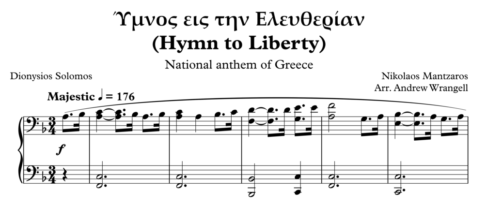 The Greek national anthem was written by Nikolaos Mantzaros, based on a poem by Dionysios Solomos. Known as the "Hymn to Liberty", the national anthem of Greece was written to honour the Greeks independence after centuries of Ottoman rule. This piano arrangement is majestic and powerful and would be perfect for anyone who wants to add a great national anthem to their repertoire. This arrangement is professionally tailored to upper intermediate and advanced level pianists.