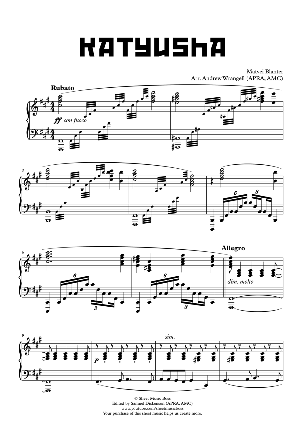 Our challenging Sheet Music Boss arrangement of Katyusha is great to play for a concert! Your purchase includes the PDF sheet music, mp3, midi and Synthesia file. Enjoy! :)