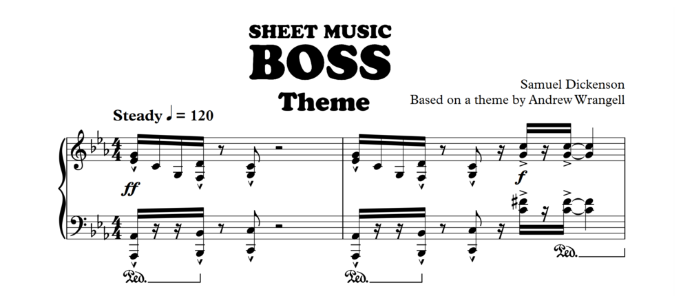 The iconic Sheet Music Boss theme, composed by Samuel Dickenson from a stinger theme written by Andrew Wrangell.