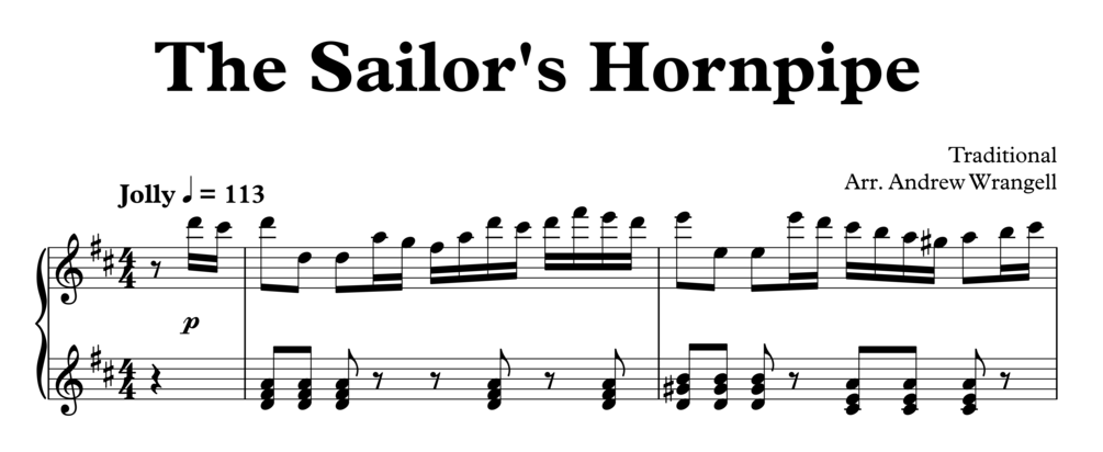 The Sailor's Hornpipe is a traditional tune, first published as the "College Hornpipe" in 1797 or 1798 by J. Dale (London). The comical nature of the music mixed well with the appearances of the tune in popular culture: Groucho Marx used the tune as well as Warner Bros. with Sylvester the Cat and Walt Disney with Donald Duck. Even the popular cartoon Popeye began using the tune in the opening credits from the 1930s. The Sailor's Hornpipe has become relatively ubiquitous, and that makes this arrangement all the better for learning! Put this in your repertoire and you'll have the entire audience whistling along: guaranteed! This piano arrangement is prepared for intermediate level pianists and above.
