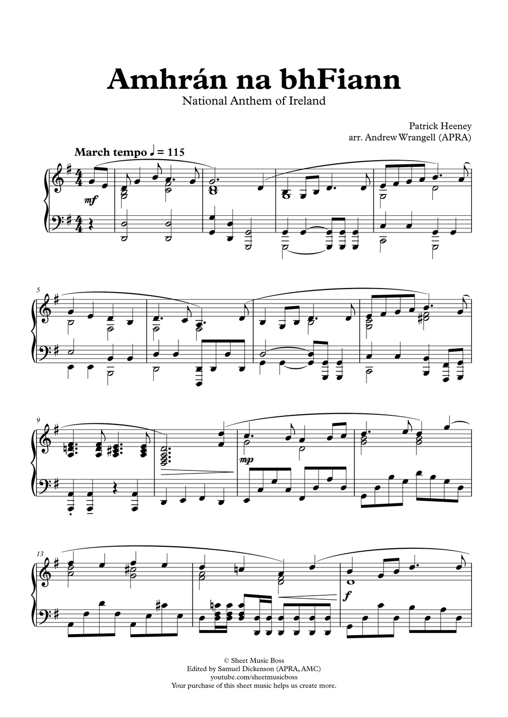 Amhrán na bhFiann (National Anthem of Ireland) (Piano Sheet Music PDF, MIDI, and MP3)