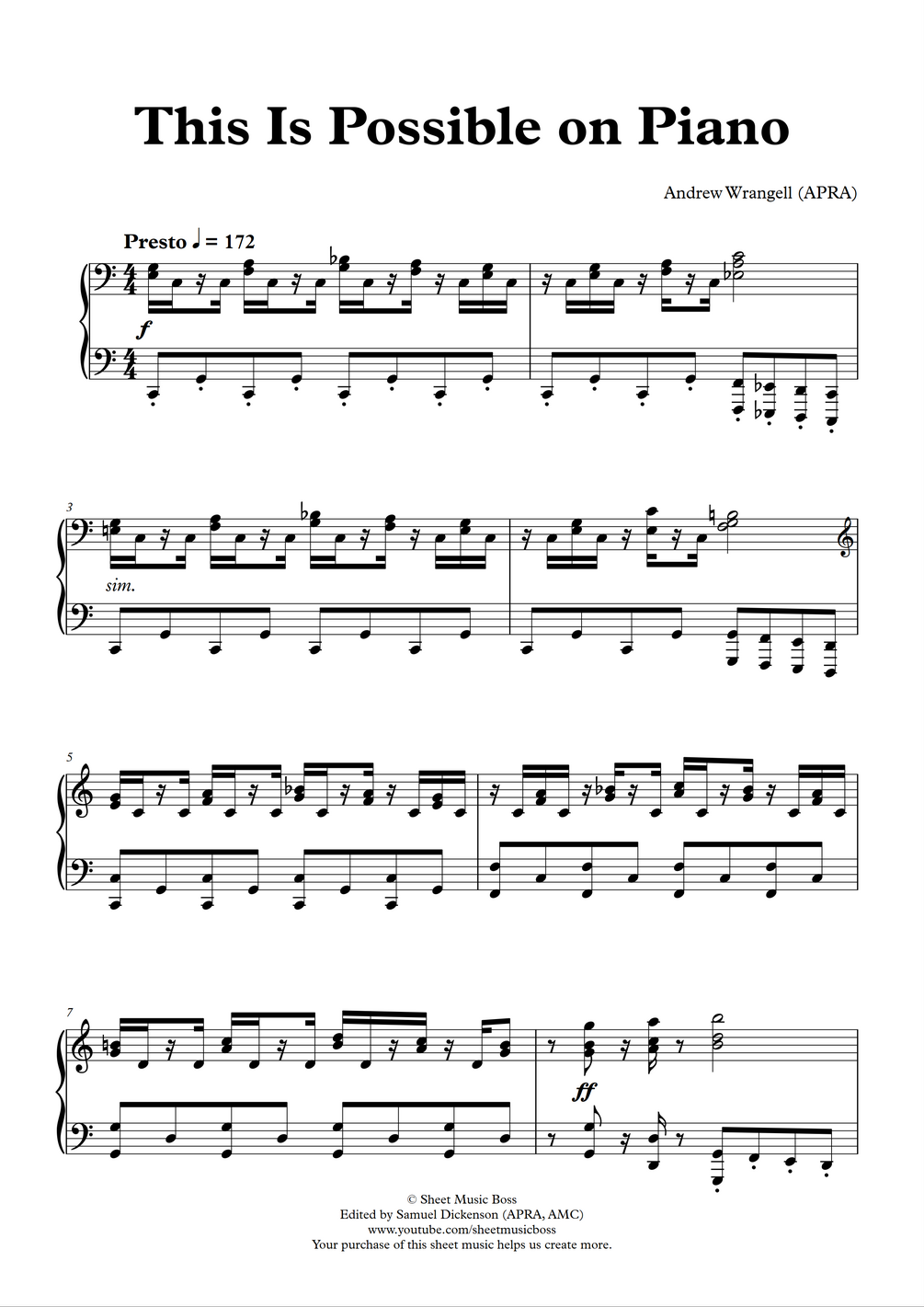 This Is Possible on Piano is... ...actually possible on piano! It is a showpiece written for the purpose of showing off in a fun and exciting way. Written especially to entertain and delight, This Is Possible on Piano will be an amazing piece to learn and play for your friends!