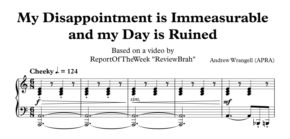 This piano work reimagines Reviewbrah's characteristic line as lyrics to a song, featuring Reviewbrah himself as the lead vocalist. We hope you enjoy playing this funny little piece as much as we enjoyed making it!