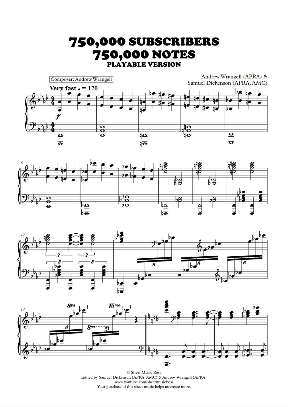 It was a glorious feeling hitting 750,000 subscribers on Sheet Music Boss! We we both excited and determined to reach the next milestone! This fantastic subscriber special shows exactly how we felt: with music! If you are looking for the next impressive piano piece to add to your repertoire, this might just be what you are after. This brilliant showpiece combines relentless rhythmic ostinati with ever-growing motivic development that reaches an exciting peak that you will want to play over and over again!